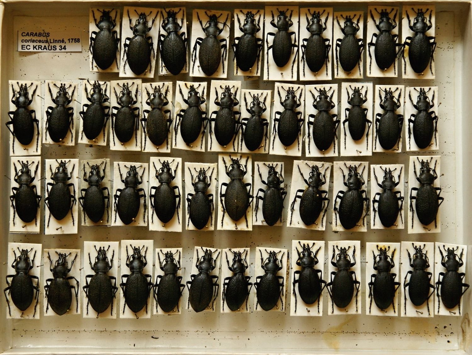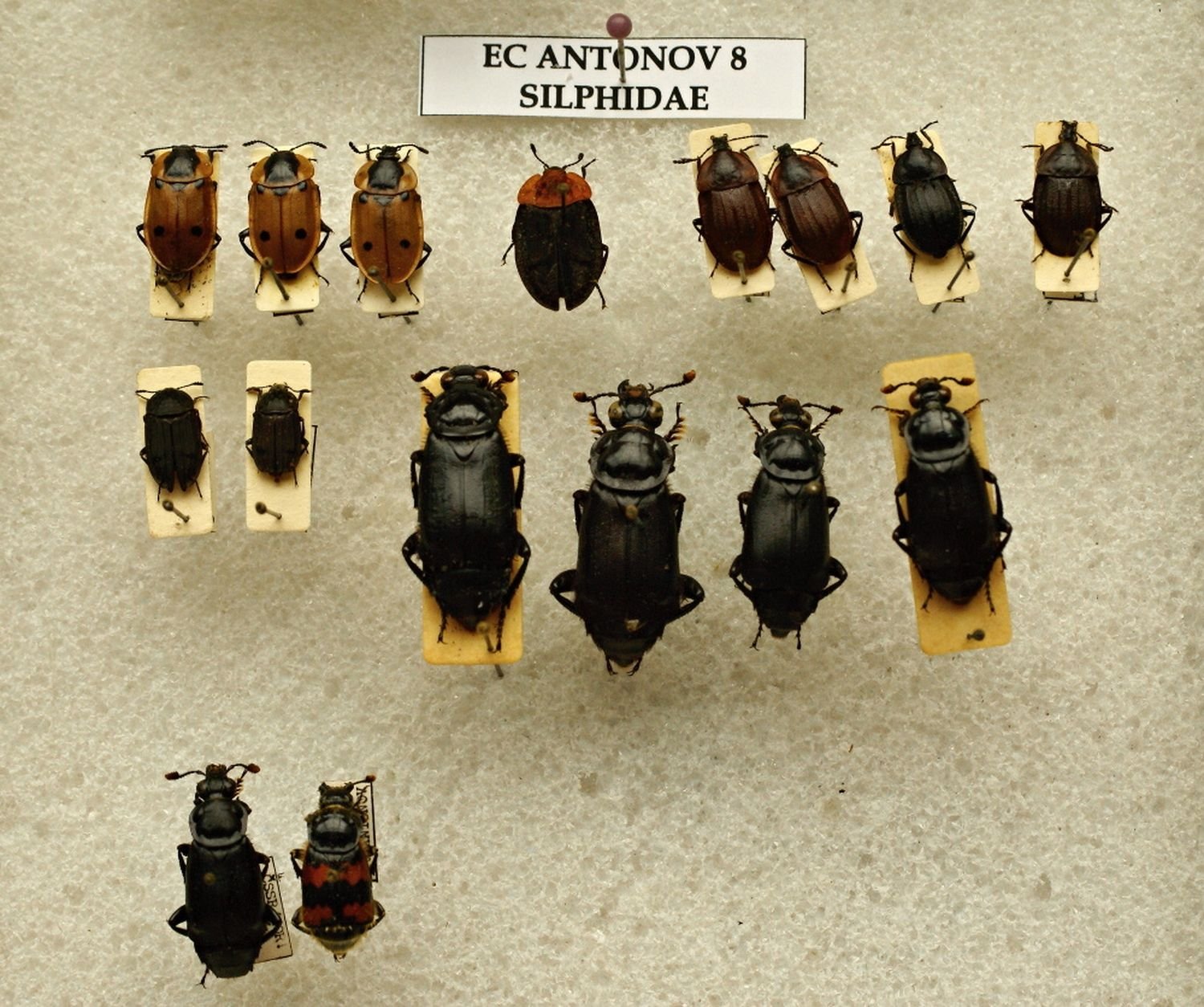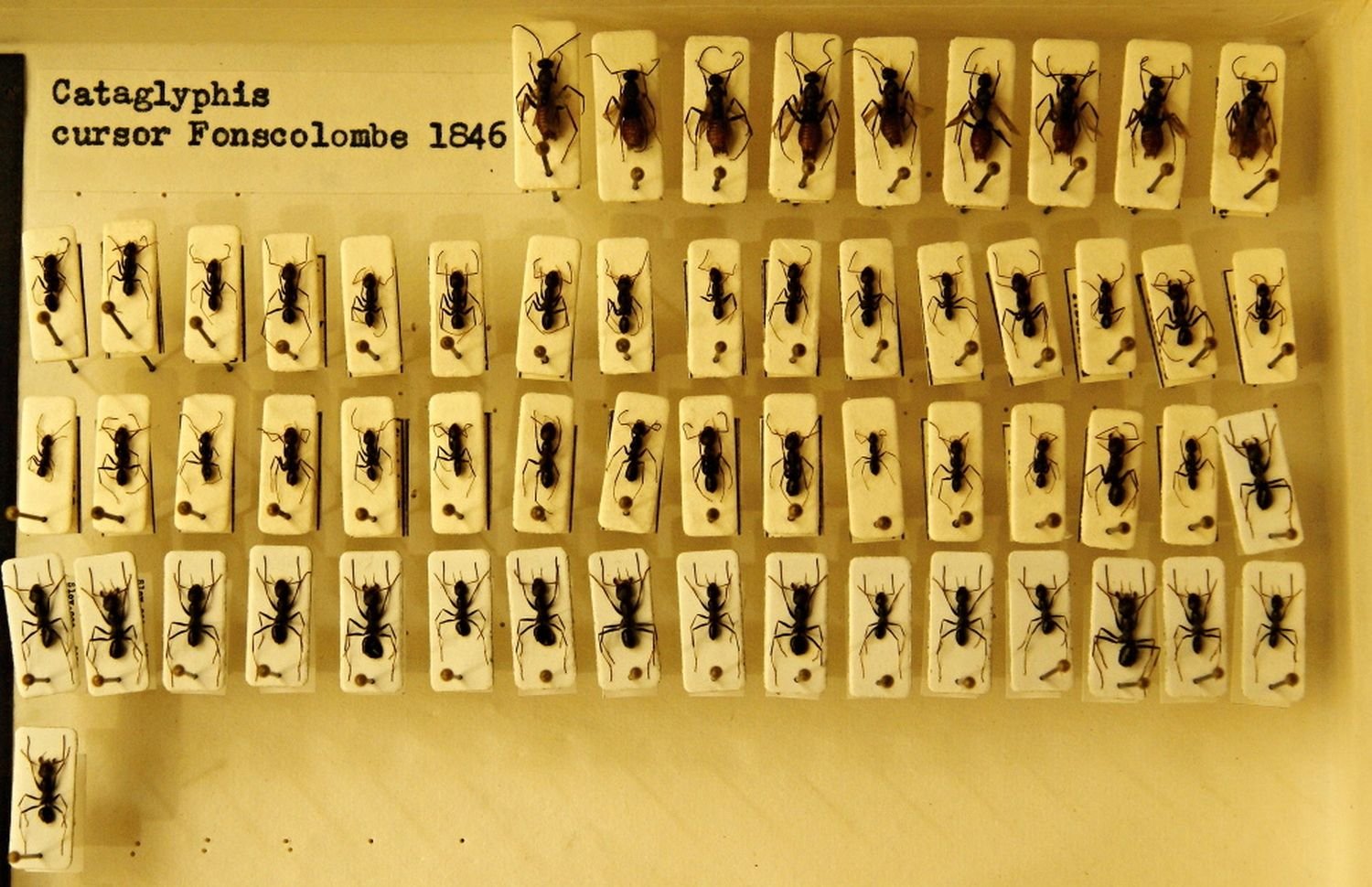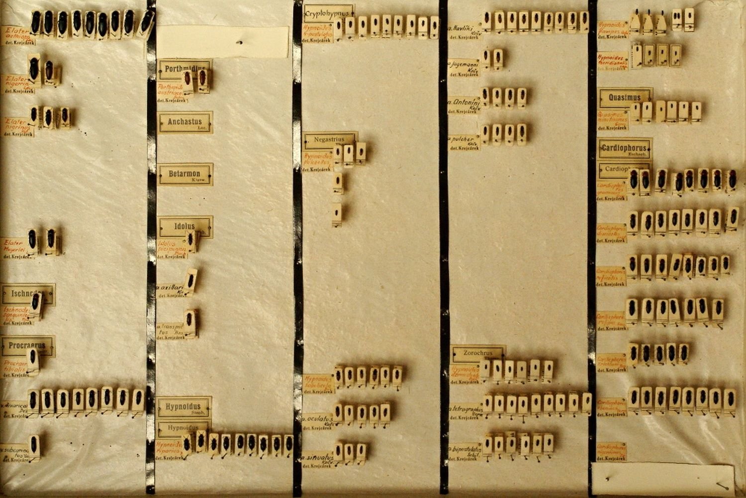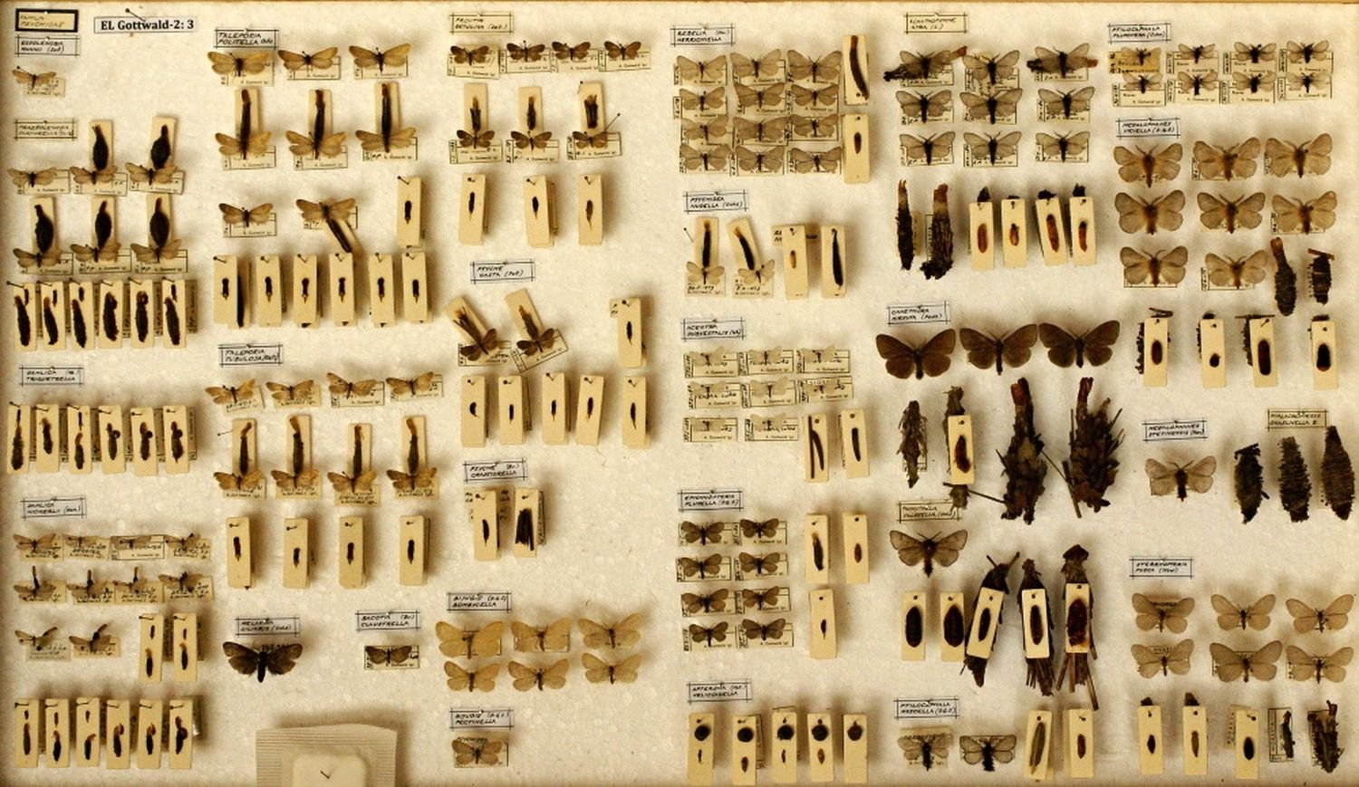 EH 204. FORMICIDAE: Cataglyphis cursor Fonscolombe, 1846.P. Bezděčka, specialista na mravence, coll., leg. et det.Lokality: Slovensko, Kečovo Datum sběru: 1.6.1981; 22.8.1987 EO 2/3.  ORTHOPTERA: Barbitistes constrictus Brunner von Wattenwyl, 1878.Ondřej Ginter coll., leg. et det.Lokalita: Penčice.Datum sběru: 10.9.1940 EO 5/68. ORTHOPTERA: Decticus verrucivorus (Linnaeus, 1758).Ondřej Ginter coll., leg. et det.Lokalita: Hostýn.Datum sběru: 28.8.1942 103/63. HETEROPTERA: různé druhy ploštic.Sbírku vytvářel Adolf Černý 1930 – 1955.Lokality: okolí Zlína, Uh. Hradiště, Bzenec, Kobylí, Rohatec, Štípa, Fryšták, etc. 137/64. COLEOPTERA: Buprestidae.Adolf Černý coll., různí entomologové leg. et det.Kovaříkovítí brouci sbíraní v první polovině 20 století převážně v regionu JV Moravy. EO ANTONOV 1. ORTHOPTERA: Gryllotalpidae: Gryllotalpa.Alexandr Antonov coll. et leg., krtonožka (pravděpodobně obecná), byla sbírána na lokalitě Krivoj Rog v Ukrajině během srpna  v roce 1987. EOD31/9. ODONATA: Libellulidae: Sympetrum flaveolum (Linnaeus, 1758).Ladislav Krejcárek coll. et leg., Petr Jeziorski det. 1993.Lokalita: Fryšták – přehrada, datum sběru: VII.1965. uložení entomologické sbírky uložení entomologické sbírky uložení entomologické sbírky 145/63 COLEOPTERA: Elateridae (168 ks).Kovaříkovítí brouci sbíraní v polovině 20 století převážně v regionu JV Moravy, soubor sestavil a brouky determinoval L. Krejcárek, tehdejší pracovník muzea. EC ANTONOV 8. COLEOPTERA: Silphidae, 16 ks mrchožroutovitých brouků, A. Antonov coll. et leg.Lokalita: různé (ČR, Slovensko, Bulharsko), vše sbíráno v roce 1964 EC BEZD 837. CARABIDAE: Carabus hungaricus Fabricius, 1792.Pavel Bezděčka coll., leg. et det.Lokalita: Uh. Hradiště, u obchodu se zeleninou, pravděpodobně impor. kus.Datum sběru: 15.10.1989 ECCERAM 4/6. COLEOPTERA: Cerambycidae: Aegosoma scabricorne (Scopoli, 1763).O. Fiala leg., datum neuvedeno, pravděpodobně 40. nebo 50. léta 20. st.Lokalita: Kroměříž env. EC KRAUS 34. CARABIDAE: Carabus coriaceus Linnaeus, 1758.Svatopluk Krause coll., leg. et det.Lokality: především JV MoravaSbíráno v letech 1971 – 2001 EL38/27. LEPIDOPTERA: Brintesia circe (Fabricius, 1775).Ladislav Krejcárek leg.Lokalita: okolí Uherského HradištěDatum sběru: neuvedeno (pravděpodobně 50. léta 20. st.)  EL42/41. LEPIDOPTERA: Minois dryas (Scopoli, 1763).Matěj Valenta coll., leg. et det.Lokalita: Slovensko, Záhorská nížina, Kúty Datum sběru: 7.8.1959 EL17/28. LEPIDOPTERA: Aporia crataegi (Linnaeus, 1758).Vladimír Elsner leg. et det.Lokalita: Zoopark Lešná u Zlína.Datum sběru: 6.6.1964 EM 1. MANTIDAE: Mantis religiosa (Linnaeus, 1758).Ondřej Ginter coll., leg. et det.Lokalita: Lidéřovice (5 ks).Datum sběru: 19.8.1947 EC BEZD 804. CARABIDAE: Carabus clatratus auraniensis J. Müller, 1902.Pavel Bezděčka coll., leg. et det.Lokalita: Slov. mer., Ipelské Predmostie.Datum sběru: 23.4.1991 EC BEZD 815. CARABIDAE: Carabus auratus Linnaeus, 1761.Pavel Bezděčka coll. et det., Richter leg. Lokalita: Německo, Beiersdorf (u Löbau).Datum sběru: 7.6.1983 EL Gottwald-2 3. LEPIDOPTERA: Psychidae, Albert Gottwald coll., čeleď vakonošovití, 201 exemplářů.Motýli byli sbíráni na různých lokalitách především na Moravě a Slovensku v letech 1970 až 2007. EL Gottwald-2 4-5. LEPIDOPTERA: Brachodidae (7 ks), Zygaenidae (část z 339 ks).Albert Gottwald coll., stepníčkovití a vřetenuškovití, sbírání na různých lokalitách. EL Gottwald-2 8. LEPIDOPTERA: Sesiidae (194 ks).Albert Gottwald coll., čeleď nesytkovití, sbírání na různých lokalitách, zejména na Moravě a na Slovensku, ale také v Polsku a Makedonii. ECCERAM 3/1. COLEOPTERA: Cerambycidae: Ergates faber (Linnaeus, 1761).Alois Richter coll., leg. et det.Lokalita: Valašské Klobouky env.Datum sběru: srpen 1931. ECCERAM 9/1. COLEOPTERA: Cerambycidae: Pseudoprionus bienerti (Heyden, 1885).Alois Richter coll., Hauser leg. v roce 1894.Lokalita: Írán, pohoří Kopet Dag, Geramb. EC ANTONOV 35. COLEOPTERA: Anthribidae.Alexandr Antonov coll. et leg., čeleď větevníčkovití (3 ks).Brouci byli vypěstováni z larev sbíraných v únoru 1983 u Čalovce (Slovensko). EC ANTONOV 36. COLEOPTERA: Curculionidae. Alexandr Antonov coll. et leg., čeleď nosatcovití (13 ks).Exempláře pocházejí z různých zemí - Ukrajina, Chorvatsko, SK, ČR, Bulharsko. 205/64. COLEOPTERA: Buprestidae.Alois Richter coll., část sbírky, která byla tvořena v období 1920-45, exempláře pocházejí především z Moravy a Slovenska, početné jsou i doklady z Balkánu. EC Mlejnek-23