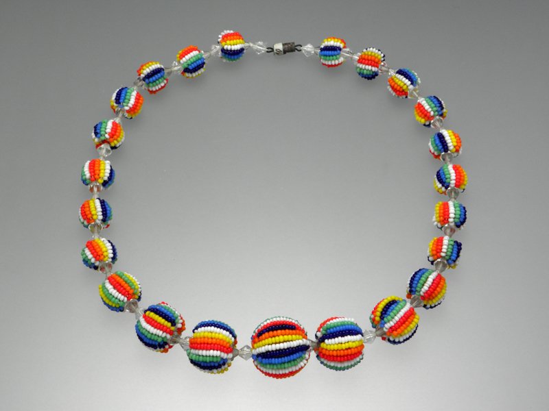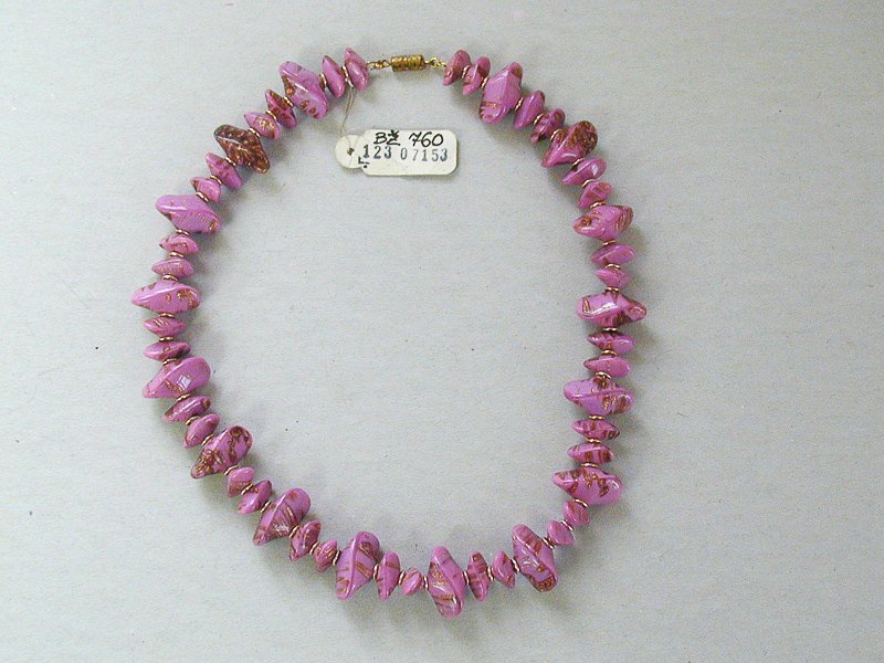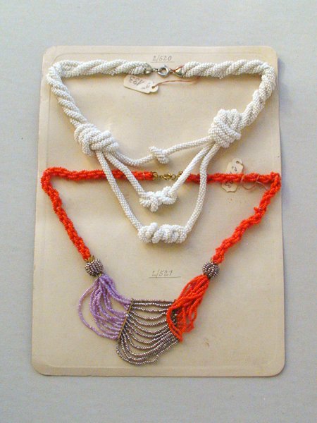 Náhrdelník-tři oplétané šňůry – skleněný rokail; po stranách stáčené, ukončené uzly; Jablonecko; 20. – 40. léta 20. století Náhrdelník-jednořadý chokr – skleněné tvarované perle v kombinaci s rokailem; Jablonecko; 20. – 40. léta 20. století Náhrdelník-jednořadý – skleněné lampové perle, kovová fólie, mezirokail; Jablonecko; 20. – 40. léta 20. století Náhrdelník-jednořadý uzlíčkovaný postupový – skleněné lampové zploštělé perle; Jablonecko; 20. – 40. léta 20. století Náhrdelník (mohamedánský) – kovový řetízek se skleněným srdcem a nápisy; Železnobrodské sklo; Železný Brod; 1967 - 1968 Vzorkovnicová karta s růžencem a náhrdelníky – mačkané skleněné perle; Jablonecko; 20. – 40. léta 20. století Pletená dečka – skleněný rokail, dvoukrátky; kruhový tvar; Jablonecko; 20. – 40. léta 20. století Náhrdelník-pětiřadá kaskáda – skleněné perle, rokail, voskované perle; Železnobrodské sklo; Železný Brod; 1951 – 1964 Náhrdelník-uzlíčkovaný chokr – skleněné lampové perle; fantazijní tvary perlí; Železnobrodské sklo; Železný Brod; 1951 – 1964 Náhrdelník – dřevěné rokaily, oplétané kuličky; Jablonecko; 20. – 40. léta 20. století Náhrdelník-jednořadý chokl – skleněné mačkané trojhranné ploché perle; Jablonecko; 20. – 40. léta 20. století Náhrdelník-jednořadý uzlíčkovaný chokr – skleněné lampové perle (háčkované) ; Jablonecko; 20. – 40. léta 20. století Náhrdelník-jednořadý-postupka – skleněné lampové perle (háčkované); Jablonecko; 20. – 40. léta 20. století Náhrdelník-jednořadý uzlíčkovaný-postupka – lampové perle s kovovou fólií; Jablonecko; 20. – 40. léta 20. století Náhrdelní-jednořadý – skleněné perle, střed lampové perle; Jablonecko; 20. – 40. léta 20. století Náhrdelník-jednořadý uzlíčkovaný – skleněné lampové perle, válcovité kulaté kuželovité; Jablonecko; 20. – 40. léta 20. století Náhrdelník-jednořadý – skleněné mačkané perle, střed vinuté krajkové zvonky; Jablonecko; 20. – 40. léta 20. století Náhrdelník-jednořadý postupový – broušené perle; Jablonecko; 20. – 40. léta 20. století Souprava-dětská bižuterie (náhrdelník, náramek) na původní kartě - rokail; Jablonecko; 20. – 40. léta 20. století Náhrdelník-jednořadý – nepravidelné skleněné perle, zdobeno aventurinem; Železnobrodské sklo; Železný Brod; 1967 - 1968 Náhrdelník límeček – skleněné perle kulaté, rokail, čípky, perle-noarit; Železnobrodské sklo; Železný Brod; 1967 - 1968 Vzorkovnicová karta skleněných náhrdelníků – stáčené rokailové šňůry, obšívané kuličky; Jablonecko; 20. – 40. léta 20. století Vzorkovnicová karta se soupravou (náhrdelník límeček, náramek) – splétaný rokail, pancrový řetízek; Jablonecko; 20. – 40. léta 20. století Pletená dečka – skleněný rokail; středový květinový motiv, kruhový tvar; Jablonecko; 20. – 40. léta 20. století Pletená dečka – skleněný rokail, dvoukrátky; čtvercový tvar; Jablonecko; 20. – 40. léta 20. století Vzorkovnicová karta se soupravou (náhrdelník, manžeta, pásek) – skleněný rokail; Zásada u Železného Brodu; 40. léta 20. století Depozitář skleněné bižuterie 02 Depozitář skleněné bižuterie 01 Depozitář skleněné bižuterie 03 Depozitář skleněné bižuterie 04