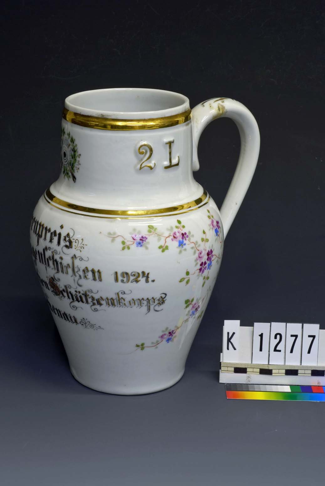 K 1245  Keramický podnos v kovové montáži, geometrický dekor žlutý s černou konturou, zn : QM Sova Jílové, 50. léta 20. století r : 23,5cm K 1250 Keramické podšálky s kovovou montáží, dekor - silueta dívky a šampusové skleničky, zn. Gebr. Mehner Eulau, 1935, průměr : 8,2 cm K 1254 Podnos kulatý, keramický s kovovou montáží, 3 nožky, 2 ucha, styliz. květy růží, zn. Mehner GM K 1260 Láhev kameninová, kulatá, na inkoust, barevná etiketa, Aug. Leonhardi, Bodenbach A/Elbe, 1.třetina 20.století, průměr 10,7cm, výška 35 cm K 1269  Talíř, porcelán, hluboký, černobílý geometrický dekor s girlandami růží zn. Krautzberger Teplitz; 30. léta20. století,  prům. 230 mm K 1266 Hrnek, hranaté ucho, květinový dekor, značeno - Ditmar a Urbach, po r. 1926; v : 85, prům. 83 mm K 1279 Závěsný mlýnek, a) porcelánový zásobník na kávu; b) s pokličkou - dřevěná podložka; c) klička, cibulový vzor; Zn. : korunka Dubí, 2001, rozm. 140 x 340 x120 mm Pohled do depozitáře keramiky v tunelovém depozitáři K 1246  Mísa, kulatá hladká, konicky rozevřená, uvnitř bílá glazura, vně jasně žlutá glazura, zn . Jílové - dvě razítka sova  menší určitelná, větší S K Made in Czechoslovakia č. 52, r: dna 13 cm, K 1247 Porcelánový talíř, obtisk - tři grácie, okraj zlacený, zn. Loket EPIAG č. 76, č. 22, 70. léta 20. stol., r 247 mm K 1248  Kameninová mísa, uvnitř bílá, vně modrozelená; dekor : čtverečky (černé a vínové barvy), zn. sova v kruhu Jílové u Děčína, m. č. 12, 50. - 60. léta 20. stol., r 198 mm K 1251 Porcelánový talíř, kulatý, motiv květů, zn. Fürstenberg zeit 1747 West Germany, 2. pol. 20. stol., průměr : 24 cm K 1252/1 Porcelánový tácek na pivo. a) na dne plastický květ, b) sedm žeber; a) EPL, b) GM; 60. - 80. l. 20. stol. pohled na uložení závěsných talířů v depozitáři keramiky K 1253/ 1-5 Kameninový servis, osmihranné talíře, ; zn. Burslem, T.O. BROWN - WESTHSAD, MOGEN? & CO. 1. pol.  20. st. a) měl. talíř, 26 cm; b) hl. talíř,  25 cm; c)dezert. tal, e) cukřenka v 5,5cm K 1257 Láhev kameninová, kulatá, na inkoust, červenomodrá etiketa, Aug. Leonhardi Bodenbach A/E ,1.třetina 20.století,  průměr 10,6 cm ,výška 35 c K 1261 Tácek s kovovou montáží, keramika, zn : GM, Gebr. Mehner, Jílové kolem roku 1935, Made in Czechoslovakia 508 A, sklápěcí ucho, dekor hroznového vína, průměr :15 cm. Podšálky - keramika s kov.montáží, barevný květinový dekor, zn : GM, Gbr.Mehner, Jílové kolem roku 1935, průměr : 10 cm 1263 Váza secesní, tělo v dolní části vyduté, dvě hranatá ucha, hnědobéžová glazura, mramorová, irizující efekt, plastický dekor kroužků - kovový povrch, glazura nezn., Ledvice, kol. 1920, v 220mm K 1265 Hrnek, hranaté ucho, bílá glazura, dekor stříkaný modře, větvička třešní, zn. Jílové GM;  40. léta 20. století v : 90, prům. 80 K 1267 Konvička na mléko, hruškovitý tvar, hubička, esovité ucho, květinový dekor,  19. století, zn. erb Vídeň?; v : 140 mm K 1270 a – c Torzo servisu, a) velký talíř, b) dezertní talíř, c) šálek. Silnostěnný porcelán, modře - linky a CR (Carolus) veslařský klub, kolem 1900 zn. Loket; a) prům. 240, b) 200, c) v : 72 mm K 1273 Mísa - oválná, zlacená na okraji čtyři zlaté znaky DESTA, zn. Klášterec n. Ohří TK Thun, 60. - 70. l. 20. stol.; rozm. 380 x 275 x 30 mm K 1277 Džbán, porcelán, malovaný - květinový dekor, zlaté linky, nápis německy - I. cena Měšťanského střeleckého spolku ve Šluknově, 30. léta 20. století,  v : 22,5 cm, prům. : 9,3 cm K 1281 Obal na květináč s uchy, porcelán, modrý kobaltový dekor, cibulový vzor, Zn. : korunka Dubí, v : 185 mm, horní prům. 220, dna 128 mm;  2001 K 1285 a,b Lampa se stínítkem - vitráž; a) porcelánové tělo s  cibulovým dekorem,  b) stínítko - vitráž, bílé a modré sklo v komb. s porcelánovými čtverečky, s cibulovým vzorem, Zn. Dubí; v : 375 K 1258/2  Kolekce porcel. talířů; 1) Kostel, 2) Děčínský zámek, 3) Kostel sv. Václava a Blažeje, 4) Masarykovo náměstí, 5) Kostel Povýšení sv. Kříže, 6) Okresní soud;  bílý porcelán, prům. 205 mm Pohled do depozitáře Porcelánu a keramiky v tunelovém depozitáři Pohled do depozitáře Porcelánu a keramiky v tunelovém depozitáři Pohled do depozitáře keramiky v tunelovém depozitáři