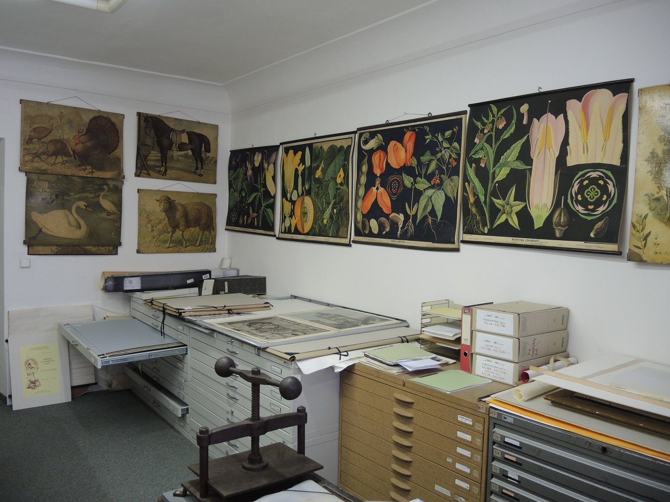 Jenewein Felix: Karel IV., školní obraz, konec 19. stol. (52,3 x 75,7 cm). Drahoňovský Josef: Jan Amos Komenský odkazující svůj Kšaft národu, keramika patinovaná, 1913 (výška: 52 cm, sokl 31 x 33 cm). Gareis Antonín Jan: ilustrace k románu Boženy Němcové Babička, prémie k „Humoristickým listům“ na rok 1866, xylografie (52 x 64 cm). Lindner Gustav Adolf: Počítání v obrazech – číslice 2, školní obraz, 1875 (40 x 57 cm). Kašpar Adolf: Poprava českých pánů na Staroměstském náměstí v r. 1621, školní obraz (95,5 x 63,5 cm). Schuler Théophile: Učitelův svátek; mědirytina, konec 19. stol. (18 x 14 cm). Morstadt Vincenc: Pražský most, mědirytina, konec 19. stol. (23,6 x 17,4 cm). Svolinský Karel/Švengsbír Jiří: 600. výročí založení Karlovy univerzity–Karel IV., poštovní známka s pravým kupónem, 1948 (5,8 x 3,3 cm). Švengsbír Jiří: 300 let – Opera didactica omnia, poštovní známka, ocelotisk, 1957 (3,3 x 1,6 cm). Born Adolf: Bruslařská škola v Naardenu, litografie barevná, 1995 (90 x 77 cm). Born Adolf: Rembrandt portrétuje Komenského, litografie barevná, konec 20. stol., (68,5 x 61,5 cm). Anonym: Přijímání žáka do školy, olej na plátně, kolem 1820 (55 x 69 cm). Nedbal Václav: Komenský Jan Amos v pracovně, olej na plátně, 1911 (120 x 160 cm). Mysliveček J. Václav: Ve třídě, olej na plátně, 1868 (56,5 x 46 cm). Kitzberger Igor: Jan Amos Komenský, bronz, reliéfní portrét na mramorovém soklu, 2009 (celk. výška – 50 cm). odznak pamětní: Národní slavnost a otevření školy v Horšovském Týně 1923, hliník (max. šířka: 2,4 cm, max.výška: 3,2 cm). Pícha L.: Domek Na sboru v Kunvaldu, plaketa pamětní, žlutý kov, 1957 (prům.–7 cm). Pícha L.: Domek Na sboru v Kunvaldu, plaketa pamětní, žlutý kov, 1957 (prům.–7cm). anonym: Obrázky pro elementární výuku – Zemědělství, litografie, nakladatel Trensentsky M., Vídeň, kol. 1840 ( 53,8 x 43,4 cm). anonym: Obrazy k názornému vyučování – Řemesla, litografie, nakladatel F. Tempsky, okolo r. 1900 (dvoulist 33,8 x 43,5 cm). anonym: Obrazy k názornému vyučování – Ptáci, litografie, nakladatel F. Tempsky, okolo r. 1900 (dvoulist 33,8 x 43,5 cm). Hey Paul: O Červené Karkulce, školní obraz, okolo r. 1900 (102 x 70 cm). anonym: O Budulínkovi, školní obraz, nakladatel Unger Josef, 1934 (70 x100,5 cm). Amerling Karel Slavoj/Liebisch František: Život v přírodě v jednotlivých měsících, školní obraz, 50. – 60. léta 19. stol. (36,4 x 27 cm). Kempter H.: Jaro–Při potoku, školní obraz, nakladatel Janský Karel, Tábor (64 x 89 cm). Kempter H.: Zima–Při potoku, školní obraz, nakladatel Janský Karel, Tábor (64 x 91,2 cm). Kunzfeld A.: Byt, školní obraz, nakladatel Hölzel Eduard, Vídeň, Olomouc, 2. polovina 19. stol. (138 x 93 cm). Hey Paul: Léto–V zahradě, školní obraz, nakladatel C. C. Meinhold & Söhne v Drážďanech, poč. 20. stol. (69 x 89,5 cm). Minařík Jan: Komenského desatero k šťastnému životu, školní obraz, 1. třetina 20. stol. (67,5 x 51,5 cm). Lauda Richard: Dobývání cukrovky na Podřipsku, školní obraz, 1929 (95 x 64 cm). Polášek Viktor: Ve škole XVIII. století, školní obraz, 1951 (86 x 60,5 cm). Kočí Josef: Kupecký krám, školní obraz, 1931 (95 x 63,3 cm). Týml J.: Ze světa do světa, školní obraz, 1940 (89,5 x 63 cm). Pospíšil Antonín: Osobní nádraží, školní obraz, 30. léta 20. stol. (100 x 70,5 cm). Kopsa Jan, učitel: Abeceda – písmeno ž, školní obraz, 1930 (33,8 x 24,5 cm). anonym: písmeno o, O, školní obraz, konec 19. stol. (42,5 x 59,8 cm). Baumbruck Jaroslav: Živá abeceda–písmeno p, P, školní obraz, 1953 (69,8 x 49,7cm). anonym: Obrázkové tabule k vyučování počtů s číslem 4, školní tabulka, okolo r. 1900,nakladatel Janský Karel, Tábor (65 x 49,5 cm). Jenewein Felix: Marie Terezie, školní obraz, konec 19. stol. (55,3 x 73,9 cm). Senft A.: Čech se svou družinou na Řípu, školní obraz, nákladem Leop. Doležala, řídícího učitele, 1. pol. 20. stol. (81,7 x 60,6 cm). Hetteš Josef Ferdinand: Rostislav vítá sv. věrozvěsty na Moravu, školní obraz, 1. pol. 20. stol. (83 x 60,5 cm). Mucha Alfons: Zavedení slovanské liturgie, školní obraz, 1. pol. 20. stol. (94,7 x 63,2 cm). Boháč Emanuel: Bitva na Bílé Hoře dne 8. listopadu 1620, školní obraz, 1928 (78,5 x 62 cm). Stříbrný Vladimír: Komenský se loučí s vlastí, školní obraz, 1924 (93 x 61,5 cm). Brožík Václav: Mistr Jan Hus před koncilem kostnickým, školní obraz, 1948 (100 x 62,5 cm). Špillar Karel: Padlým hrdinům, školní obraz, 1919 (74,5 x 56 cm). Čutta Václav: První president Československé republiky T. G. Masaryk vítán 21. prosince 1918 v Horním Dvořišti, školní obraz, 1. třetina 20. stol. (77,5 x 57,5 cm). Cihelka Oldřich: Dráha dějin (sestavil Eduard Štorch), školní obraz, 1937 (129 x 98,3 cm). Matoušek František: Dobytí Bastily 14. července 1789, školní obraz, 1955 (59,5 x 84 cm). Čembers V.: Shromáždění šlechty za Kateřiny II., školní obraz, 1. třetina 20. stol. (87,5 x 66 cm). Melicharová Hermína: Výstava Jan Amos Komenský, plakát, 1957 (116 x 83 cm). Uložení Historické podsbírky – fond školních obrazů. Uložení Historické podsbírky – fond školních obrazů. Uložení Historické podsbírky – fond školních obrazů.