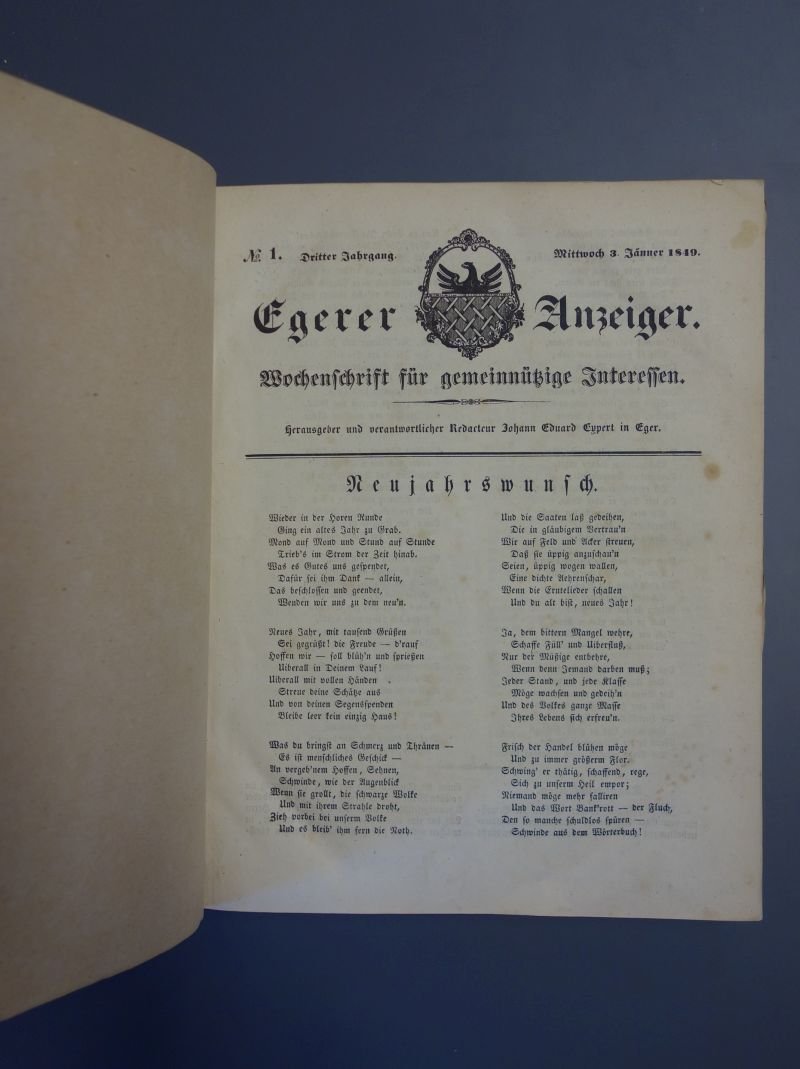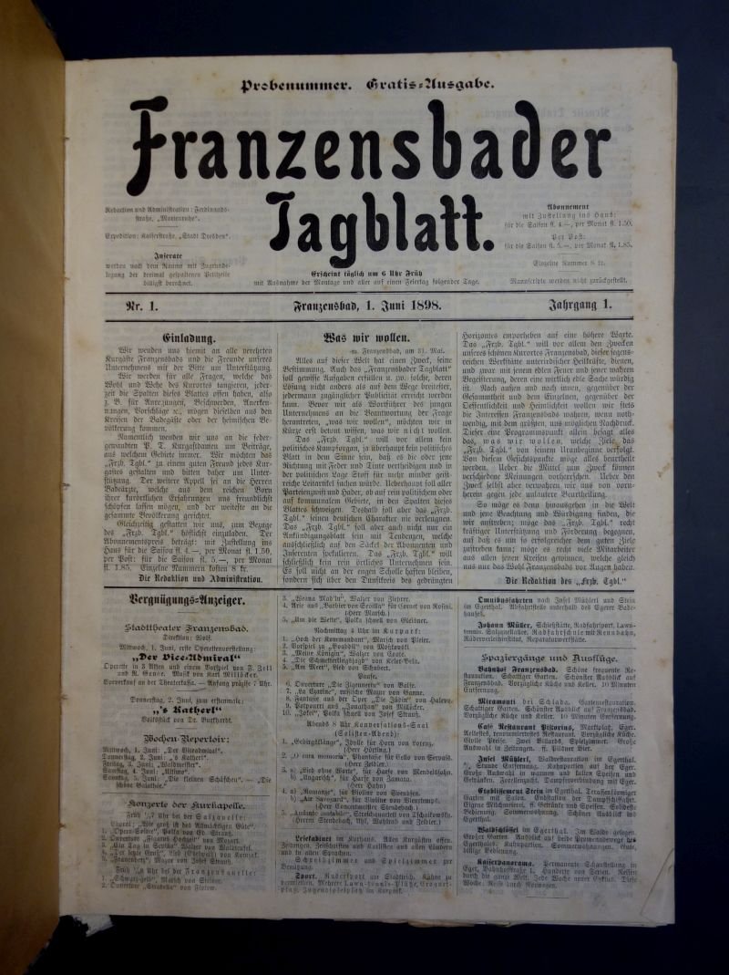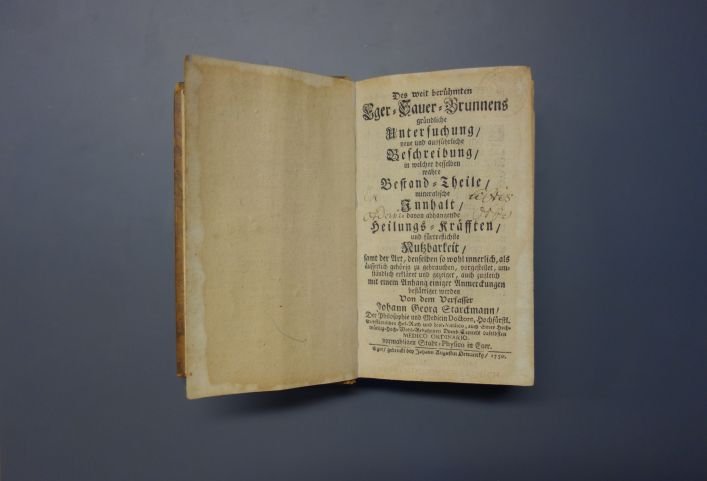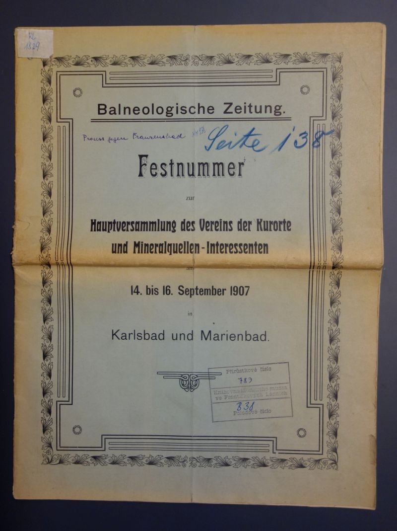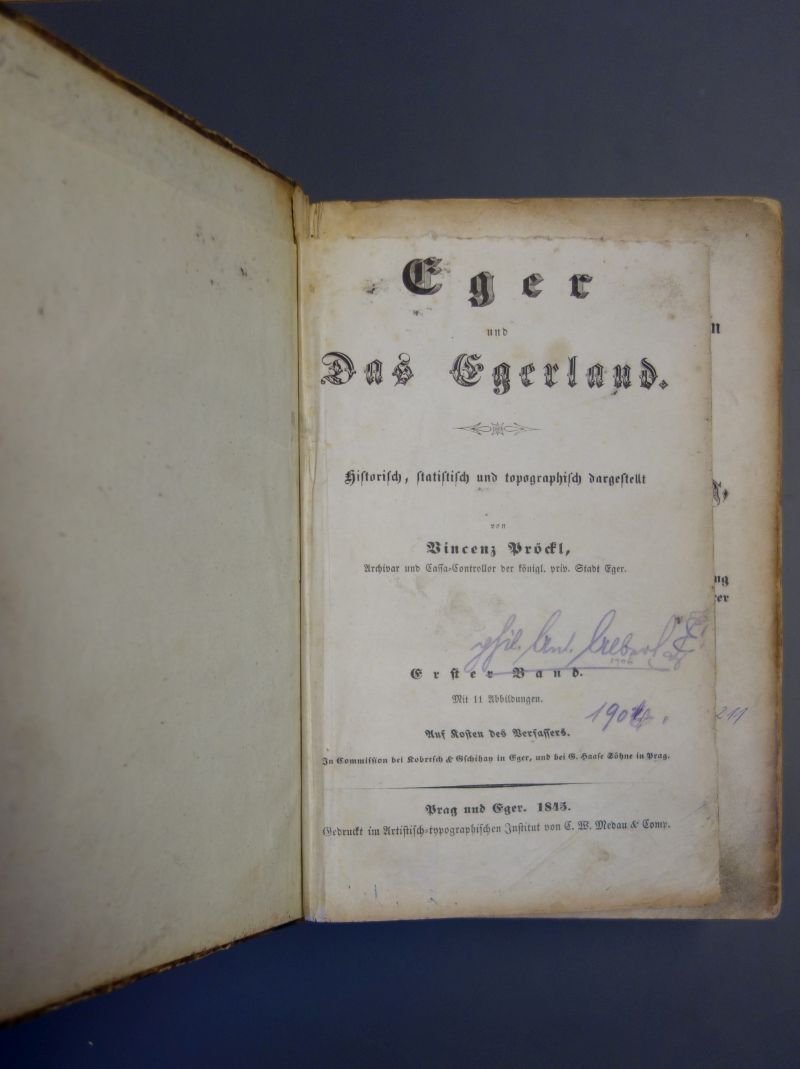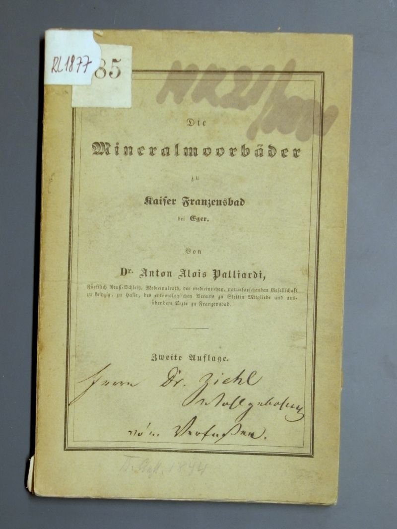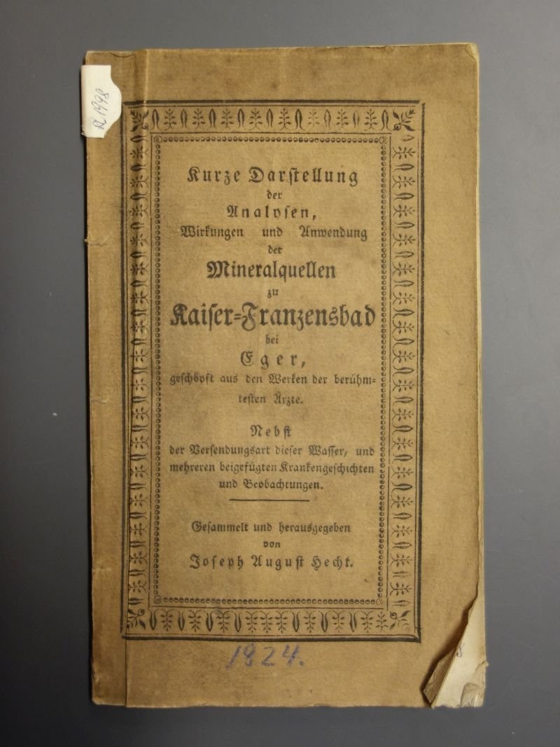 RL 2318 - Gemeinde-Amtsblatt für die Kurstadt Franzensbad. Franzensbad: Stadtrat Franzensbad, 1924, roč. 15. RL 127 - PRÖCKL, Vinzenz. Eger und das Egerland: Historisch, statistisch und topographisch dargestellt. Díl I a II. 1. vyd. Prag und Eger: C. W. Medau & Co., 1845. RL 669 - Egerer Jahrbuch: Kalender für das Egerland und seine Freunde. Eger: J. Kobrtsch & Gschihay, 1877, roč. 7. RL 751 - Liste der angekommenen Brunnengäste im Kaiser Franzensbad im Jahre 1816. Eger und Franzensbad: Joseph Kobrtsch, 1816. RL 939 - Franzensbader Tagblatt. Eger-Franzensbad: J. Kobrtsch & Gschihay, 1898, roč. 1. První svazek ucelené sbírky františkolázeňských novin vycházejících v letech 1898 – 1938. RL 1829 - Balneologische Zeitung: Festnummer zur Hauptversammlung des Vereines der Kurorte und Mineralquellen-Interessenten am 14. bis 16. September... Berlin: Deutscher Verlag, 1907, roč. XVIII, č.25 RL 1872 - REUSS, Franz Ambros. Anleitung zum Gebrauche des Egerbrunnens, oder Franzensbades. Prag und Leipzig: Albrecht & Co., 1794. RL 1998 - HECHT, Joseph August. Kurze Darstellung der Analysen, Wirkungen und Anwendung der Mineralquellen zu Kaiser-Franzensbad bei Eger...Eger: Joseph Kobrtsch, 1824. RL 1880 - CZERNY, Josef. Egerländer Liederbuch für Männerchor: Partitur. Sv. I. Eger: Selbstverlag Josef Czerny. RL 2029 - Mittheilungen des Vereines für Geschichte der Deutschen in Böhmen. Prag: H. Dominicus/Leipzig und Wien: F. A. Brockhaus, 1891, roč. XXIX: č. III. RL 2285 - STARCKMANN, Johann Georg. Des weit berühmten Eger-Sauerbrunnens gründliche Untersuchung...Eger: Druck J. A. Orwansky, 1750. RL 2851 - Egerer Anzeiger: Wochenschrift für gemeinnützige Interessen. Eger: J. Kobrtsch und Gschihay, 1849, roč. 3. Část ze souboru prvních ročníků nejstaršího novodobého periodika na Chebsku. RL 2970 - ROTH, Eberhard Rudolph. Memorabilia Europae. Ulm: Matthäus Wagner, 1684. RL 2978 - TABERNAEMONTANUS, Jacobus Theodorus. Neuw Wasserschatz. Frankfurt a./M.: 1584. RL 1941 - Beratung des Bürgermeisters mit den Ratsherren 1939 – 1943 der Stadt Franzensbad. Svázané strojopisné záznamy ze schůzí městské rady. RL 329 - Typen und Trachten aus dem Egerlande: Lichtdruckbilder. Wien: Haufler, Schmutterer & Co., 1886. RL 356 - LOIMANN, Med. & Chir. Dr. Gustav. Franzensbad in chirurgischen Krankheitsfällen. Wien, 1855. RL 358 - Zur Feier des 100jährigen Jubiläums von Kaiser Franzensbad. Franzensbad: Selbstverlag des Bürgermeisteramtes in Franzensbad, 1893. RL 422 - JOHN, Alois. Goethe-Festschrift der Kurstadt Franzensbad aus Anlaß der Feier des 100. Todestages J. W. Goethes. Franzensbad: Verlag der Kurverwaltung Franzensbad, 1932. RL 637 - Unser Egerland: Blätter für Egerländer Volkskunde - Organ des Vereines für Egerländer Volkskunde. Eger: Alois John, 1897 - 1901, roč. 1 - 5. RL 2913 - Denkbuch über die Allerhöchste Anwesenheit Ihrer  k. k. Majestäten Franz des Ersten und Caroline Auguste in Böhmen im Jahre 1833. Prag: 1836. RL 2973 - SIBYLLENUS, Petrus. Petri Sibylleni, Egranae Reipublicae Physici, de Peste Liber absolutissimus,...Pragae: Ex Officina Georgii Melantrichii ab Auentino, 1564. RL 2975 - PACHELBEL-GEHAG, Johann Christoph von. Ausführliche Beschreibung des Fichtel-Berges in Nordgau liegend, in Dreyen Theilen abgefasset. Leipzig: Johann Christian Martini, 1716. RL 1856 - Curstadt Franzensbad in Böhmen: Saison vom 1. Mai bis 1. October. Franzensbad: Verlag der Curverwaltung. (90. léta 19. stol.) Ze souboru turistických a lázeňských průvodců po Fr. Lázních aj. RL 2910 - CRANTZ, Heinrich Johann von. Gesundbrunnen der Österreichischen Monarchie. Wien: 1777. RL 1877 - PALLIARDI, Dr. Anton Alois. Die Mineralmoorbäder zu Kaiser Franzensbad bei Eger. 2. vyd. Leipzig: B. G. Teubner, 1844. Uložení sbírkových předmětů - Knihy (Knihovna Městského Muzea) Uložení sbírkových předmětů - Knihy (Knihovna Městského Muzea) Uložení sbírkových předmětů - Knihy (Knihovna Městského Muzea)